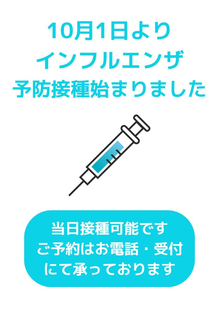 本日よりインフルエンザワクチン接種が開始となりました。当院では当日接種可能です。